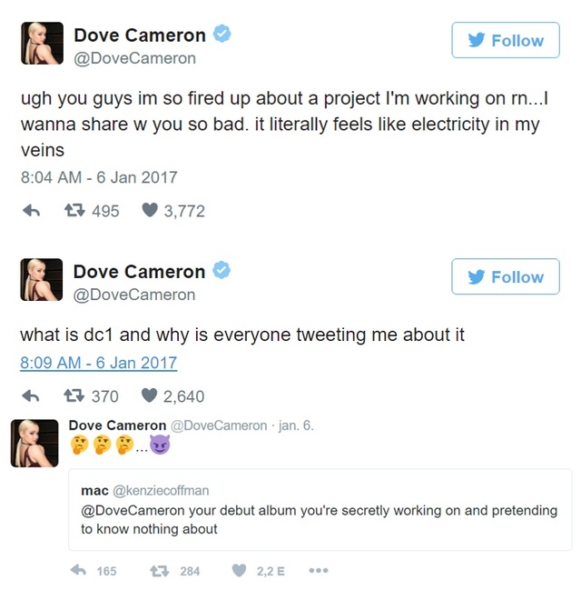 Az ugyan továbbra sem derült ki, min munkálkodik a szőke szépség, projektjét azonban elnevezték dc1-nek, ami első szólólemezére utalhat. Dove azonban nem értette, miről pusmognak fanatikusai, így megkérdezte tőlük: