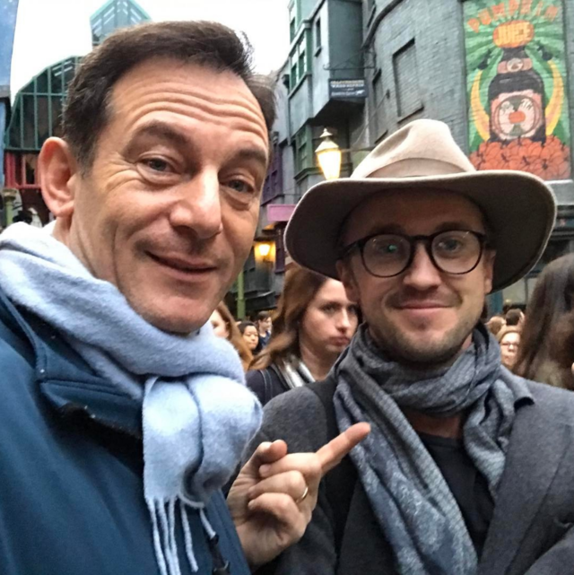 A szériában Lucius Malfoyt alakító Jason Isaacs ugyanis úgy döntött ellátogat az orlandói The Wizarding World of Harry Potter elnevezésű élményparkba, de szerencsére jócskán akadt útitársa a kalandon – Tom Felton (Draco Malfoy) és Matthew Lewis (Neville Longbottom) is elkísérte, ott pedig összefutottak egykori kollégájukkal, Warwick Davisszel (Flitwick professzor).