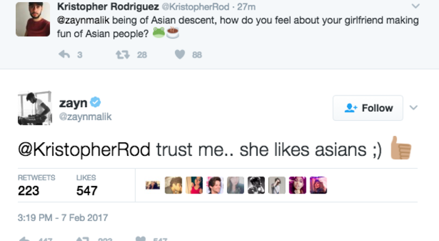 @ZaynMalik, mint ázsiai felmenőkkel rendelkező ember, hogy érzed magad, amiatt, hogy a csajod kigúnyolja az ázsiaiakat?