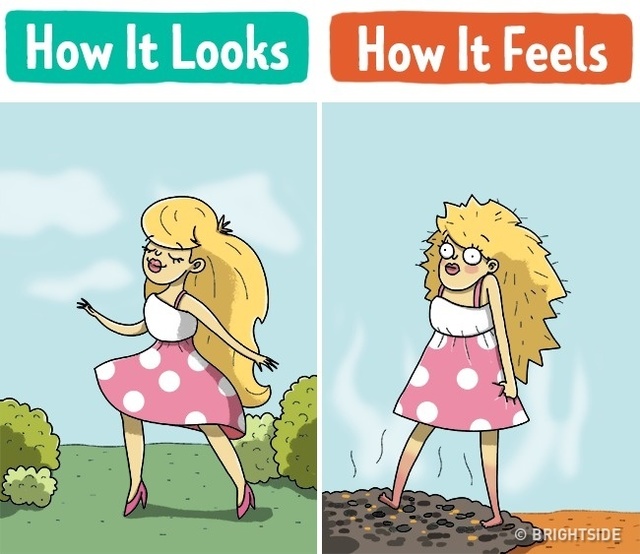 Ha nem is valljuk be, de sokszor előfordul, hogy a világ felé nem azt a képet mutatjuk magunkról, mint ahogyan érzünk. Legyen szó kínos helyzetről, egy szoros cipőről vagy egy általunk szeretett személyhez fűződő viszonyunkról, sokszor rejtve maradnak valódi érzéseink, gondolataink – ezt mutatjuk most be Mariya Zavolokina illusztrációi nyomán.