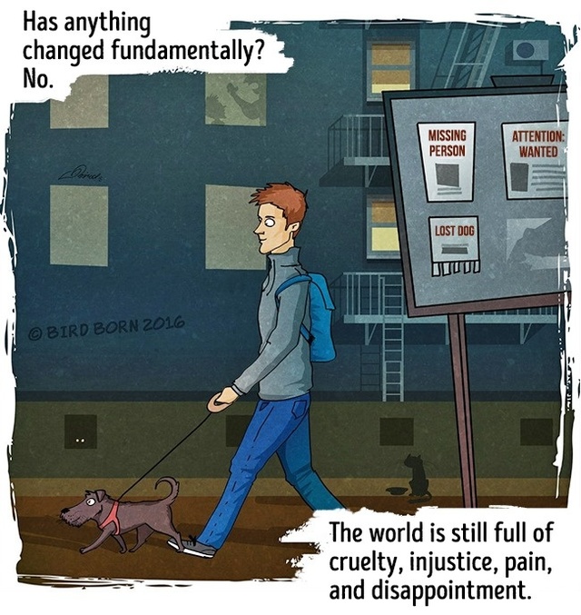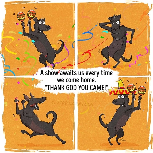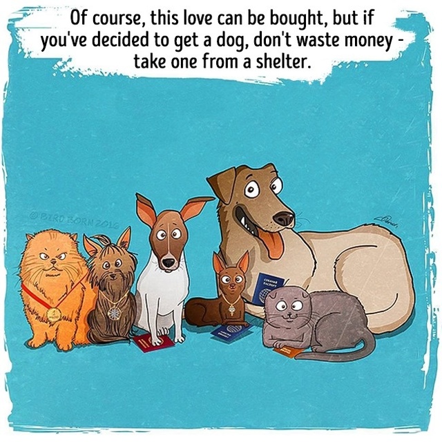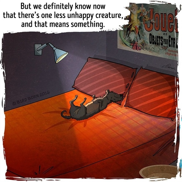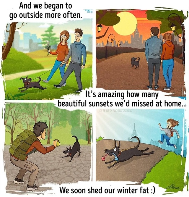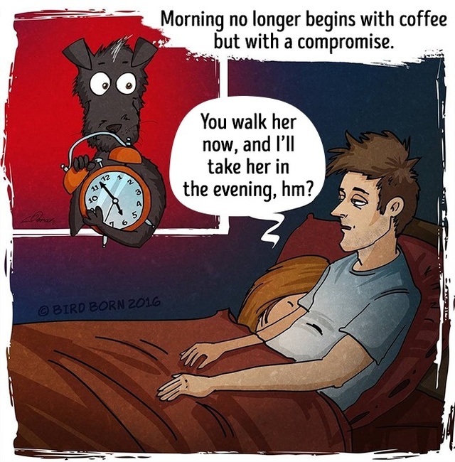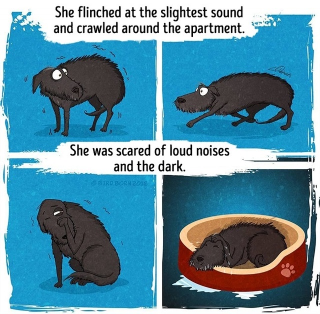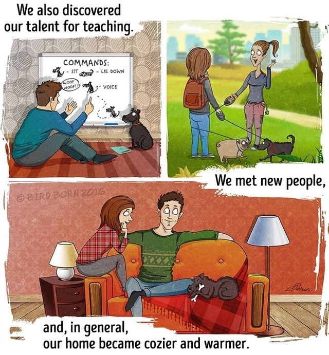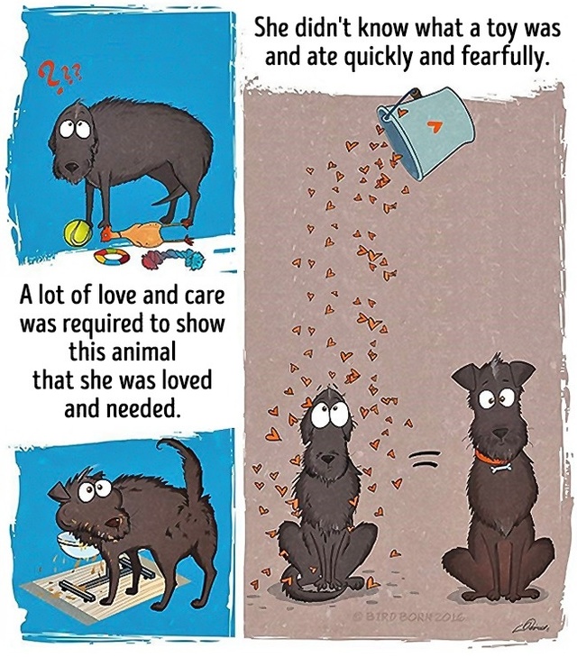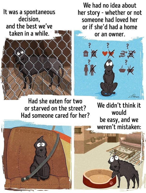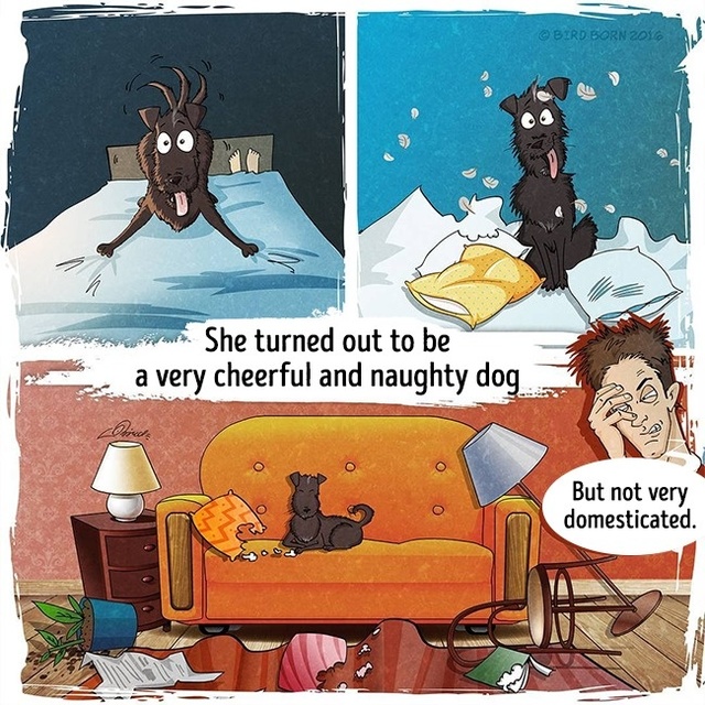 Egy állat örökbefogadása hatalmas felelősség, ugyanakkor egy életre szóló elkötelezettség is, melynek során számtalan örömteli pillanatot tapasztalhatunk meg. Persze nemcsak jó, hanem olykor kínos vagy bosszantó pillanatai is lehetnek, de egy biztos: kis kedvenceink mellett sosem leszünk magányosak és unatkozni sem fogunk! Az alábbiakban egy Bird Born nevű művész ábráin követhetjük nyomon, milyen is az élet egy menhelyről magunkhoz vett kutyával.
