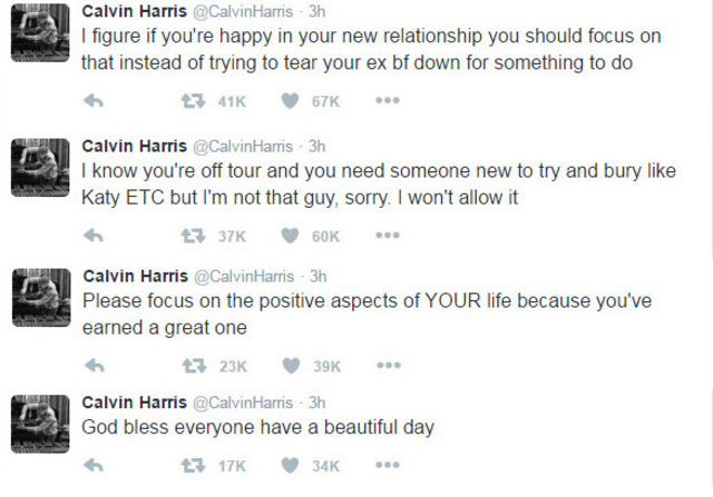 Taylor a szakításuk után hadjáratot indított Harris ellen, hogy rossz színben tüntessék fel a DJ-t ilyen vagy olyan módon. Harris ezt azonban nem nézte el, és Twitteren fakadt ki, miszerint nem fogja engedni, hogy úgy eltemesse őt TayTay, mint ahogy Katy Perryt.