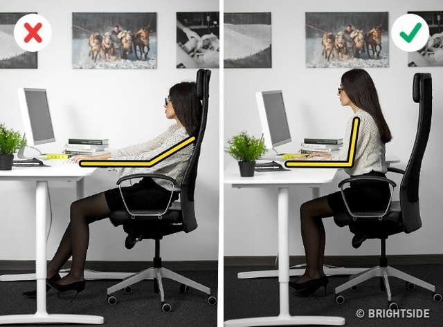 Mivel az idő nagy részében ülsz, nem mindegy, hogyan teszed azt. Ha egy mód van rá, ne tedd keresztbe a lábaidat, mert ez a testhelyzet rossz hatással lehet a vérkeringésedre, összenyomja a vénákat és zsibbadáshoz, valamint „nyughatatlan láb” szindrómához vezethet. Az első és legfontosabb, hogy úgy állítsd be a székedet, hogy a lábaid ne lógjanak, és az ülés széle ne nyomja a térdhajlatodat. A talpad a földet érje, a combjaid és a vádlid kicsivel nagyobb, mint 90°-os szöget zárjanak be.