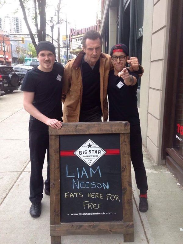 hirdetésA Big Star Sandwich Co. vancouveri üzeltének alkalmazottai is értesültek arról, hogy városukba érkezik Liam Neeson, és mivel nagy rajongói a színésznek, szerettek volna találkozni vele ott-tartózkodása alatt. Tudták, hogy magánemberként erre kicsi az esélyük, így összefogtak, és úgy döntöttek, megvendégelik Neesont.