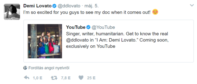 hirdetésDemi a Twitteren hozta nyilvánosságra, milyen izgatott, amiért hamarosan a rajongói is megismerhetik az ő igazi énjét a YouTube-on bemutatásra kerülő I Am: Demi Lovato című alkotás keretein belül. Arról ugyan egyelőre nem hullott le a lepel, hogy pontosan mikor is tekinthetjük meg a filmet, de minden bizonnyal nagyon rövid időn belül.