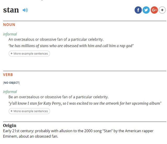 Eminem rajongói már évek óta kampányoltak azért, hogy a stan szót bevezessék a szótárakba az olyan rajongókra használva, akik megszállottan imádnak egy bizonyos hírességet. Az oxfordi szótár most be is vette a szót – főnévként és igeként is egyaránt szerepel benne.