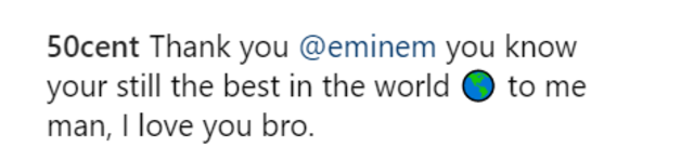 hirdetés50 Cent július 6-án ünnepelte 42. születésnapját, mely alkalomból cimborája, Eminem is felköszöntötte. Ehhez az Instagramot választotta szócsövének a rapper, ahol közzétett egy videót, melynek keretein belül azon túl, hogy felköszöntötte kollégáját, azt is bevallotta, hogy miatta fel akart hagyni a rappeléssel 2002 körül, amikor megjelent a 8 mérföld című film, és az abban elhelyezett, 50 Cent által írt Places To Go.