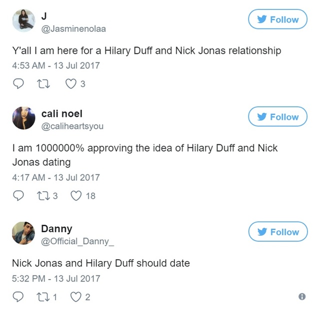 A rajongók nem is lehetnének izgatottabbak az egyébként ártatlan hozzászólás miatt – az internet népe máris belelkesült, és többen is hangot adtak abbéli véleményüknek, hogy nem lenne ellenükre, ha Nick udvarolni kezdene Hilarynek. Érdekesség, hogy bár csak öt év van köztük, két különböző generáció kedvencei voltak a Disney csatornának köszönhetően. Míg Hilary a Lizzie Maguire-nek, addig Nick a Rocktábornak (és persze akkori együttesének, a Jonas Brothersnek) köszönheti ismertségét.