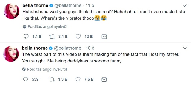 hirdetésBella Thorne bár több intim felvételt is megosztott már magáról, most azonban egy erősen pornográf anyag is felkerült az internetre, amihez szintén az ő nevét csatolják. A videó állítólag még 2016-ban készült, melyen egy hölgyet láthatunk, ahogy autójában kényezteti önmagát. Bella tagadja, hogy ő lenne a főszereplője az utólag szinkronizált felvételnek, véleményét pedig a Twitteren fejtette ki.