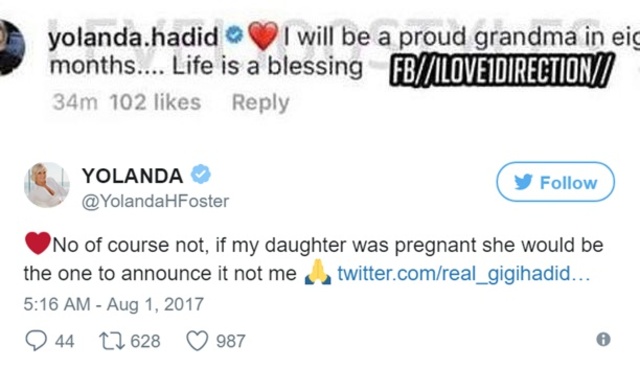 – olvashatták a rajongók Yolanda üzenetét, amit állítólag hivatalos fiókjáról csiripelt, ám nem sokkal később a Twitteren kiírta: egy szó sem igaz belőle, lánya, Gigi Hadid nem vár gyereket párjától, Zayn Maliktől.