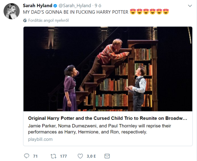 hirdetésNéhány órája hozta le a külföldi sajtó, hogy Sarah Hyland édesapja, Edward James Hyland szerepet kapott a Harry Potter és az elátkozott gyermek Broadway-en bemutatásra kerülő változatában. A színésznő nagyon belelkesült a hírtől, amiről így csiripelt a Twitteren: