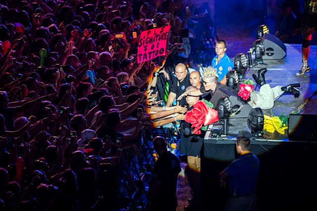 Legalábbis nagyjából: 21.30 helyett 21.40-kor lépet színpadra, de ez tulajdonképpen nem nevezhető késésnek. Előtte pedig ikonikus sláger szóltak, a közönség pedig remek hangulatban volt: együtt énekelték a Vogue-ot Madonnától, de a Paradise City-t a Guns N Rosestól is.