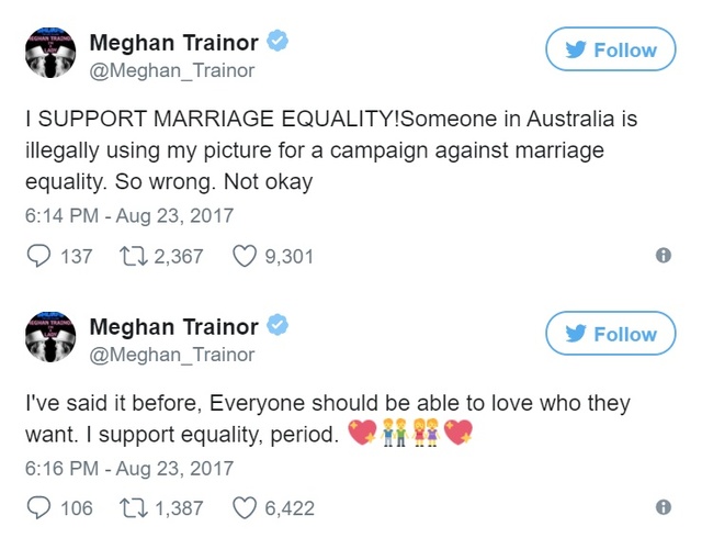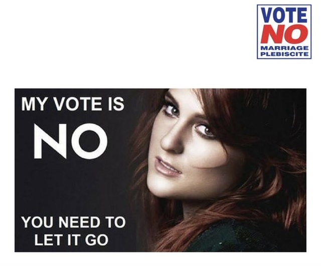 hirdetésAusztráliában még ma is heves viták folynak az azonos neműek házasságát illetően, így nem csoda, hogy megjelentek olyan propaganda csoportok, melyek bármilyen eszközt hajlandóak megragadni annak érdekében, hogy a közvélemény arra hangolják, ne támogassák a melegek házasodásához való jogát. Az egyik ilyen csoport Meghan Trainor képét használta fel egy ilyen visszatartó kampányhoz, valamint No című dalának No... you need to let it go