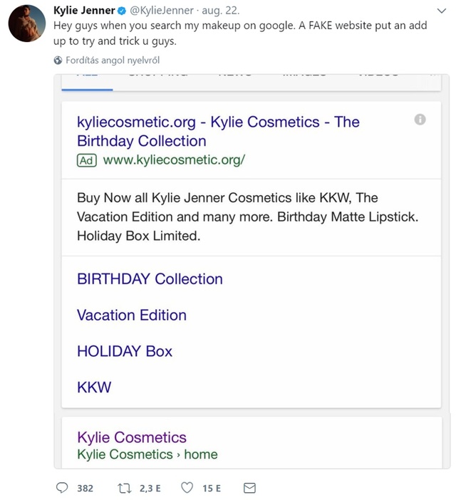 Kylie-nak is van azonban sütnivalója, így nemrég rákeresett márkájára az interneten, és meglepődve látta, hogy ott nem az ő weboldala ugrik fel elsőként, hanem egy kamu site, ami kozmetikumainak hamisítványait bocsátja forgalomba, erre pedig fel is hívta rajongói figyelmét. Ezen utánzatok megvásárlásának veszélyeiről egyébként Kylie már korábban is felvilágosította rajongóit, amikor tudatta velük, hogy ezekben a hamisítványokban olyan egészségre káros hozzávalók vannak, mint a benzin vagy a ragasztó.