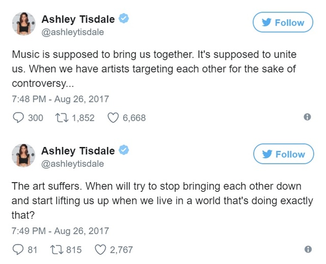 Taylor Swift hosszú idő után pénteken jelentetett meg új kislemezt a Look What You Made Me Do képében, ami minden valószínűség szerint a visszavágás egy fajtája a részéről Kim Kardashiannak és Kanye Westnek, akik nagyon kellemetlen helyzetbe hozták tavaly, amikor leleplezték, hogy hazudott a nyilvánosság előtt. A dolog Ashley Tisdale figyelmét sem kerülte el, és a Twitteren szólalt fel az ügyben.