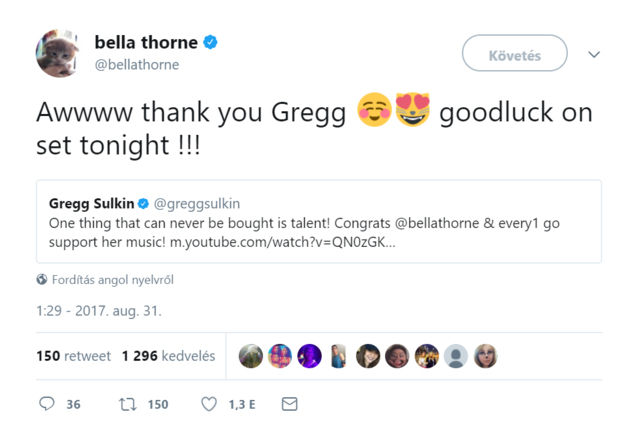 Bella és Prince közös munkájának eredményéhez egyébként még a színész-énekesnő exe, Gregg Sulkin is gratulált a Twitteren, amivel egyúttal kissé burkoltan, de azt fejezte ki, hogy piszkálhatják sokan sok mindenért volt barátnőjét, de ahhoz kétség sem fér, hogy tehetséges.