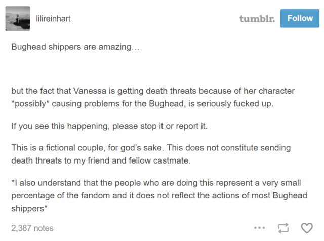A Bughead-rajongók fantasztikusak... de a tény, hogy Vanessa halálos fenyegetéseket kap, mert a karaktere *esetleg* problémákat okoz Bughead között, komolyan egy agyrém. Ha azt látjátok, hogy ez történik [valaki fenyegetőzik], állítsátok le vagy jelentsétek! Bughead egy fiktív pár, az Isten szerelmére! Halálos fenyegetéseket küldeni a barátomnak és kollégámnak nem része a dolognak