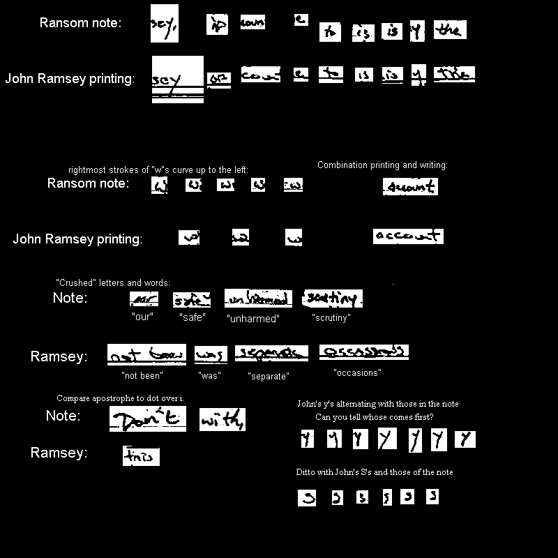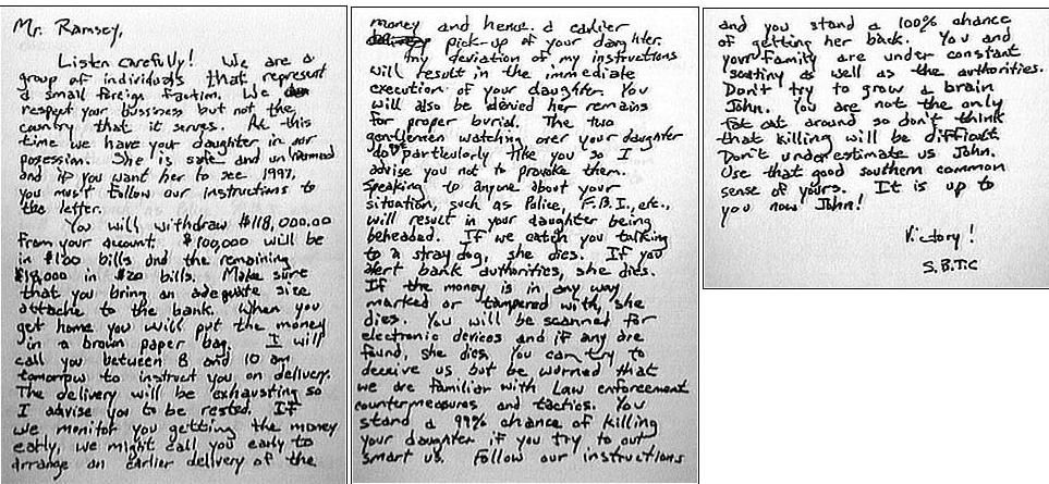 A 22 órás kihallgatás után sem jutottak előrébb az üggyel. Megérkeztek az írásszakértők is, akik összevetették az állítólagos emberrabló kézírását Patsy és John írásával is. Rengeteg hasonlatot véltek felfedezni Patsy és az „elkövető” írása között.