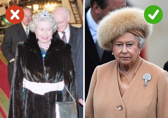 A szabályok szerint a királyi család tagjainak öltözete nem tükrözheti a luxust, a protokoll pedig megkívánja, hogy ne viseljenek szőrmét, csak nagyon ritka alkalmakra tartogathatják az ezzel ellátott ruhadarabjaikat. Ezen ritka alkalmak egyike volt, amikor II. Erzsébet királynő 1993-ban ellátogatott Oroszországba (bal oldalt). A szabály egyébként a bundákra vonatkozik, a prémmel díszített gallérok és kalapok még az elfogadható kategóriába sorolandók.