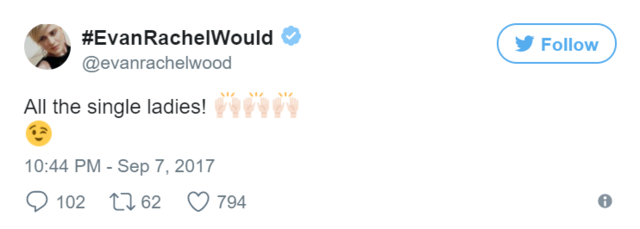 hirdetésJanuárban számoltunk be arról, hogy Zach Villa megkérte Evan Rachel Wood kezét, a színésznő pedig boldogan mondott neki igent. Rajongóik arra számítottak, hogy a pár rövidesen oltár elé áll, ám ehelyett inkább a szakítás mellett döntöttek, melynek okát nem hozták nyilvánosságra.