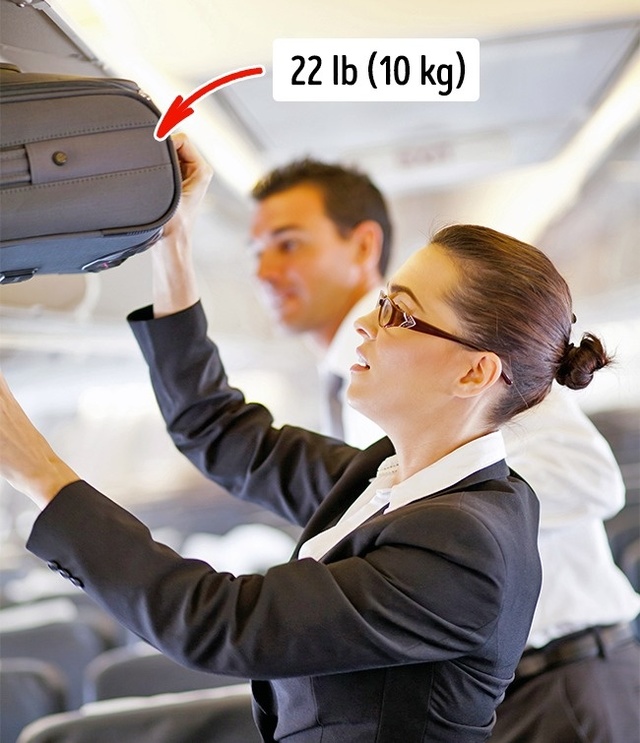 A stewardessek munkaköri leírásában benne szerepel, hogy segíteniük kell az utasoknak a csomagjaik gépen való elhelyezésében, így nem ritkán előfordul, hogy nehezebb táskákat, bőröndöket is meg kell emelniük. Példának okáért a Air New Zealandnál elvárás, hogy a stewardessek fel tudjanak emelni egy 10 kilós bőröndöt 170 centiméternyire anélkül, hogy lábujjhegyre kellene emelkedniük.