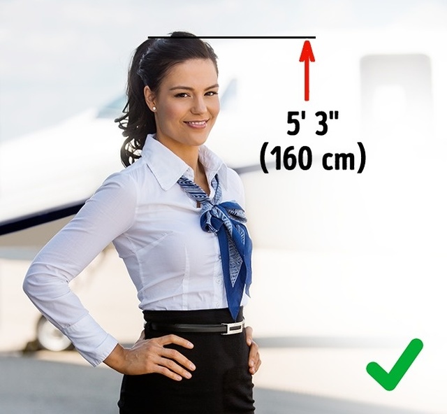 Minden légitársaságnak megvan a maga magasságra vonatkozó kritériuma, ami abból is adódik, hogy gépeiken milyen magasra kell nyújtózniuk a légiutas-kísérőknek a csomagok helyrepakolása miatt. Alapvetően egy stewardess 158-188 centiméter magas, ám az Egyesült Arab Emirátusokban nagyobb magasságot is megkövetelhetnek a dolgozóktól, hiszen a gépeiken 212 centi magasságokat is el kell érniük.