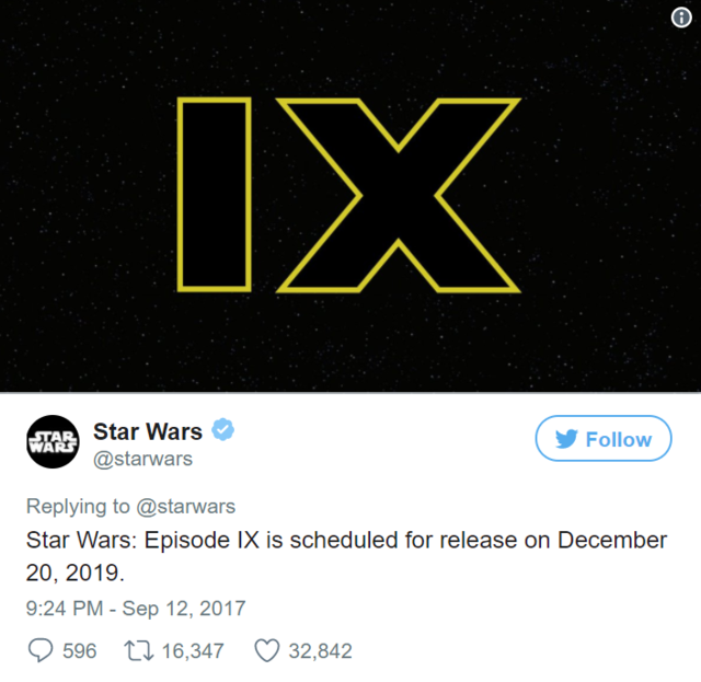 hirdetésA kilencedik Star Wars-film megjelenését eredetileg 2019 májusára datálták a készítők, ám a dátum módosult, miután Colin Trevorrow rendező visszalépett a produkciótól, helyét pedig Az ébredő Erőt is rendező J.J. Abrams foglalta el a direktori székben. Ezzel együtt immár hivatalosan is kijelenthetjük, hogy a december lesz a Star Wars-rajongók kedvenc hónapja, hiszen 2015-ben ebben a hónapban került a mozikba a fent említett Az ébredő Erő, idén szintén decemberben ülhetünk be a mozikba Az utolsó Jedikre és 2019-ben ugyanekkor térhetünk oda vissza, hogy megtekintsük a franchise új installációját.