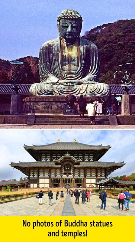 Japánban tilos bizonyos templomokat és szobrokat megörökíteni, mert úgy tartják, hogy ezzel megzavarod a szellemeket. Ezen a linken tájékozdhatsz arról, melyek azok a helyszínek, ahol egyáltalán nem lehet fényképezni, illetve fel vannak tüntetve azok is, ahol az év bizonyos részében, limitált ideig és engedéllyel ugyan, de szabad.