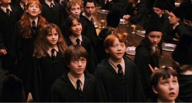 Természetesen az a jelenet is felejthetetlen, amikor Harry és a többi zöldfülű mágusnövendék először lép be a Roxfort nagytermébe. A színészek arcán tükröződő elragadtatottság valódi, ugyanis egészen a forgatásig nem láthatták a helyszínt, hogy minél hitelesebb legyen a felvételek során az első reakciójuk, amikor belépnek a helyiségbe.