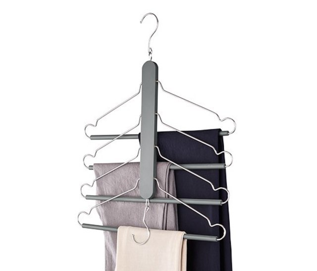 Ugyanezek a kiemelkedő minőségű alapanyagok adják az ingekhez való helytakarékos vállfa anyagát is, amely szintén forgócsuklós akasztóval készült, és bár a nevében ingek számára készült, de kialakításánál fogva nadrágok számára is alkalmas megoldás. Egyszerre 4 ruhadarabnak ad helyet az eszköz, melynek nadrágtartó rúdjain csúszásgátló, anyagkímélő bevonat, vállrészeinél pedig a ruhák akasztófüleinek kialakított bemélyedések találhatók. Mivel mindkét oldalán található egy-egy akasztó, így nagyobb hely esetén a ruhadarabok egymás mellett is lóghatnak, ha azonban egyre zsúfoltabbá válik a szekrényünk, akkor az egyik akasztó leengedésével a négy szint egymás alá kerül, és így egyetlen ruha helyére kerül be a rajta tárolt négy darab!