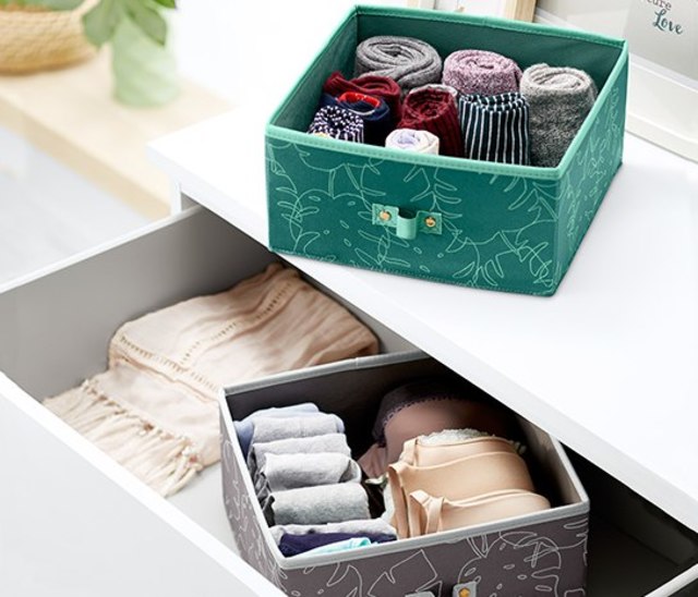 Kisebb és nagyobb méretben kaphatók olyan rendszerező dobozok is a kínálatban (2 darabos szettben), amelyek zöld és szürke mintázatukkal már azon kiegészítők sorát gyarapítják, amelyek nem csak praktikusak, hanem kifejezetten esztétikusak is. Éppen ezért ezek a dobozok akkor is szépítik a lakás összképét, ha látható helyen használjuk őket, bár elsődlegesen valóban a fehérneműs fiókok jobb átláthatóságában lehetnek a segítségünkre. A megerősített aljnak és oldalfalaknak köszönhetően stabil dobozok oldalán fogantyúk segítik a könnyebb hozzáférést, alsó részük pedig kivehető, így használaton kívül ők maguk is helytakarékosan tárolhatók.