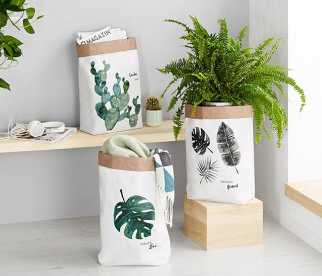 Szintén kisebb tárgyak tárolásához használható a 3 darabos papír tárolótasak szett is, ami már kifejezetten olyan céllal készült, hogy a tároló funkció mellett lakásdíszként is megállja a helyét. Az egyenként 30 l űrtartalmú, kraftpapírból készült tasakok strapabírók, így akár többször is felhasználhatók, mutatós, leveles mintájuk pedig harmonikus hatást kölcsönöz majd.