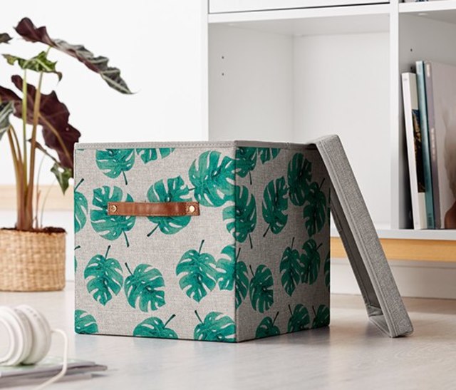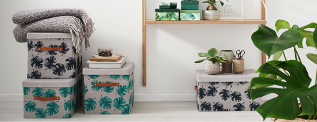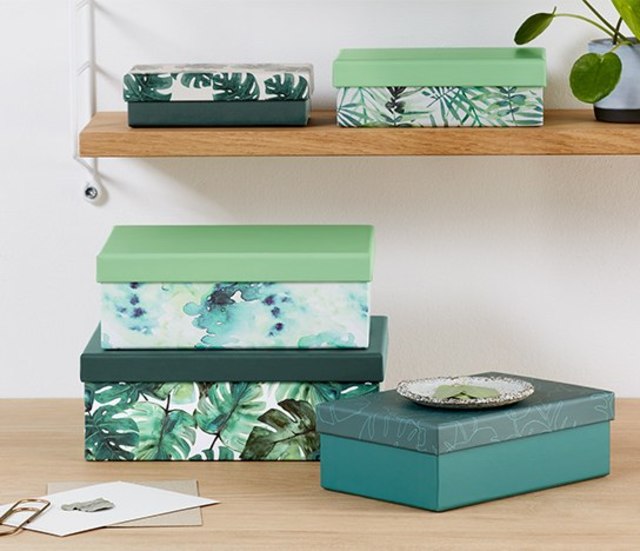 Nagyobb darabok számára kínál esztétikus, portól való védelmet jelentő tárolási lehetőséget a kétféle méretben kapható, fedeles tárolódoboz, amely szürke alapon fekete, vagy zöld nyomott levélmintával készült. A lenvászon hatású anyagon kétoldalt a könnyű kihúzást segítő, konyakszínű, bőrhatású fogantyúk találhatók, amelyeket arany szegecsek rögzítenek a dobozokhoz, amelyek alja és oldalfalai is megerősítettek, hogy stabilan tárolhassuk benne a különféle kiegészítőket, vagy akár magazinokat – hiszen a nagyobb méretű dobozok pontosan illenek az A4 méretű nyomtatványokhoz is.