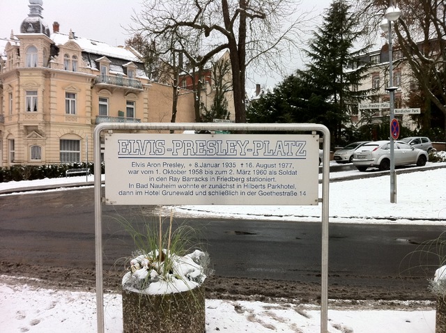 Németországban azonban rögtön kettőt is találunk. Sorkatonasága alatt Presley másfél évig élt Bad Nauheim kisvárosban, ahonnan naponta járt át Friedbergbe dolgozni. Most a két település azon verseng, hogy melyik volt Elvis igazi német otthona, és természetesen mindkettőben van egy-egy Elvis Platz, vagyis Elvis tér.