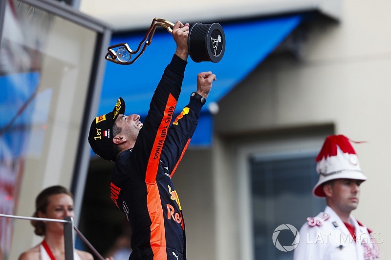 A viszonylag unalmas versenyt végül Danniel Ricciardo nyerte a Red Bullal, aki egész hétvégén tarolt, mögötte végzett Sebastian Vettel, a Ferrarival majd harmadikként ért be a címvédő Lewis Hamilton a Mercedessel. Szokásoknak megfelelően nem volt igazi pódium, bár egy kis dobogó azért elfért a hercegi pár előtt, akik a díjakat adták át. A feszült hangulatú pódiumünnepség, ahol egyedül Daniel Ricciardonak volt felhőtlen mosolya, akkor oldódott, mikor pezsgőzéskor Vettel a szabályokat felrúgva a hercegi pár fele kezdett el pezsgőzni, akik így kaptak jócskán belőle, majd a pilóták meg is kínálták a hercegség vezetőit az italból.