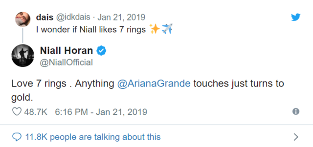 Ariana Grande néhány napja jelentette meg 7 Rings elnevezésű kislemezét, ami a hamarosan megjelenő ötödik nagylemezének utolsó beharangozó tétele is egyben. Mint kiderült, Niall Horan is nagy rajongója az énekesnőnek, ugyanis egy twitteres kérdezz-felelek keretein belül egyik rajongója feltette azt a költői kérdést, hogy vajon ő is kedveli-e Ari újdonságát, mire így válaszolt az érintett: