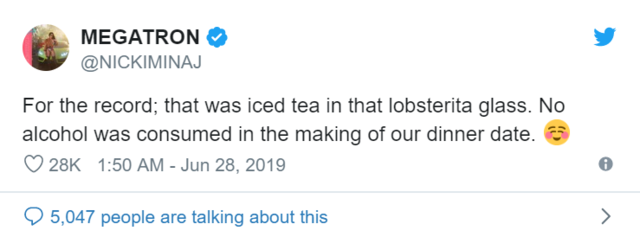 – írta a rapper a Twitteren később, mellyel azt hintette el, vigyáznia kell, nem fogyaszthat szeszes italt. Rajongói között volt, aki megjegyezte, jól is tette, hogy nem ivott, az alkohol csak ártana a babának, az érintett azonban egyelőre nem kommentálta a várandósságáról szóló pletykákat.