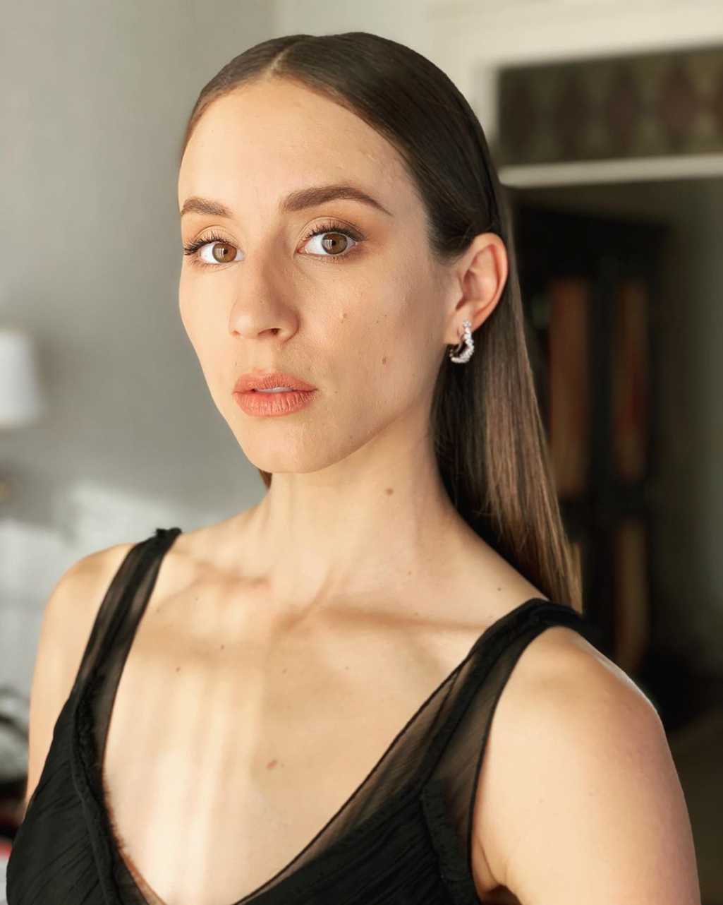 A színésznő a finom anyagú, hosszú fehér szoknyához egy púderszínű pántos felsőt választott, hogy oldja a "menyasszonyos" külsőt. Haját pedig feltűzte, míg lagziján hosszú tincseit szabadon hagyta.