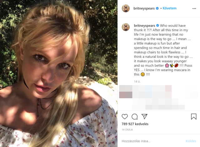 Legújabb bejegyzéseiben Britney már csupán egy kis szempillaspirált visel, és bevallása szerint sokkal jobban is érzi így magát, mint korábban, amikor teljes arcát kozmetikai termékek borították.