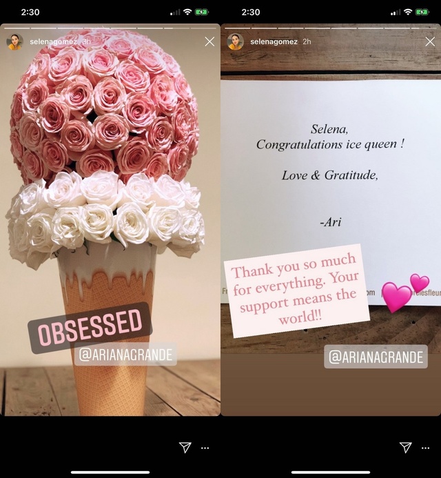 Nemrégiben jelent meg Selena Gomez a BLACKPINK-kel közösen elkészített, Ice Cream címet viselő szerzeménye, melynek alkalmából Ariana Grande is gratulálni szeretett volna kolléganőjének, ezt pedig egy nem mindennapi ajándék formájában tette meg. A Thank U, Next előadója ugyanis egy hatalmas fagylaltot mintázó virágcsokrot küldött Gomeznek az alábbi üzenet kíséretében: