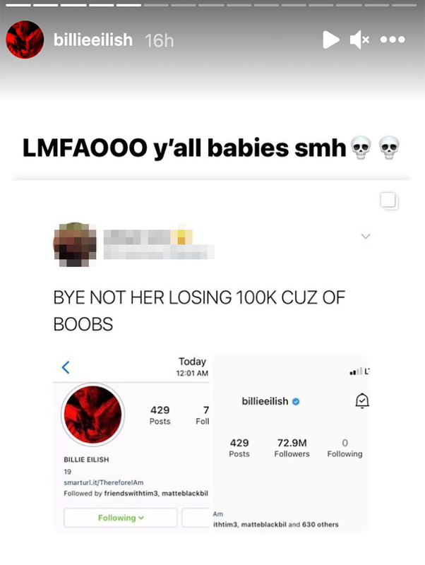 Billie Eilish több fotót osztott meg Instagram-sztorijában, amelyen női mellek láthatóak. Ez úgy néz ki, sok rajongójának, vagy éppen a rajongók szüleinek nem jött be, hiszen több mint százezer követőt vesztett el alig egy óra alatt.
