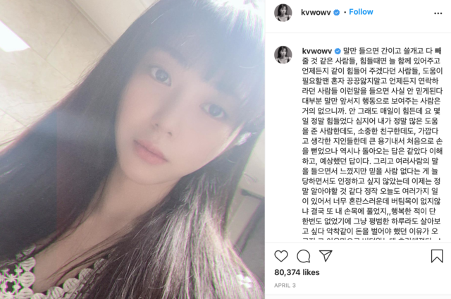 Mina, az AOA egykori tagja április 26-án, koreai idő szerint éjfél táján egy önmarcangoló képet tett közzé Instagram fiókján.