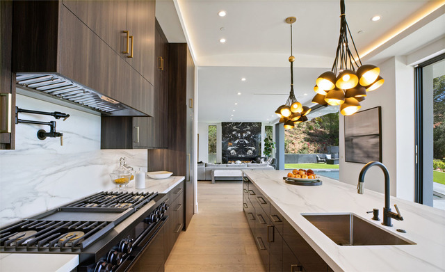 Az európai ihletésű konyhában vízeséses kvarcit munkalapok és luxus készülékek teszik kellemesebbé a főzés pillanatait.