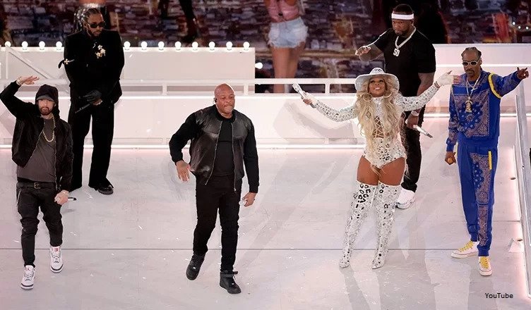 A játékot a SoFi kaliforniai stadionban rendezték meg, és Dr. Dre mellett Snoop Dogg, 50 Cent, Mary J. Blige, Kendick Lamar és Eminem is feltűnt.
