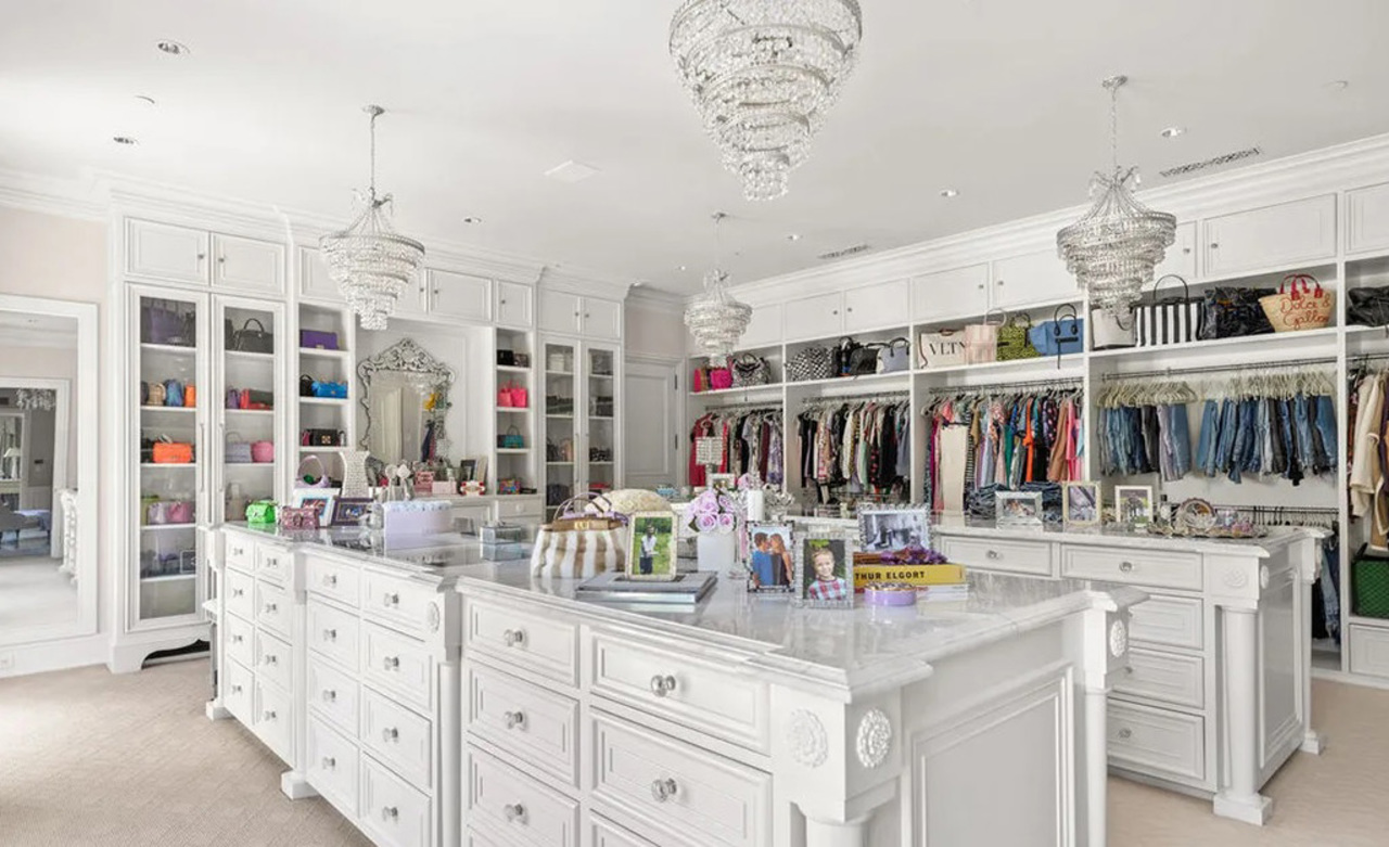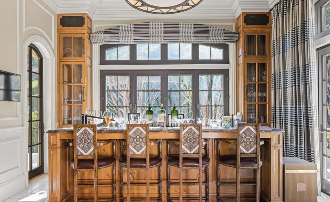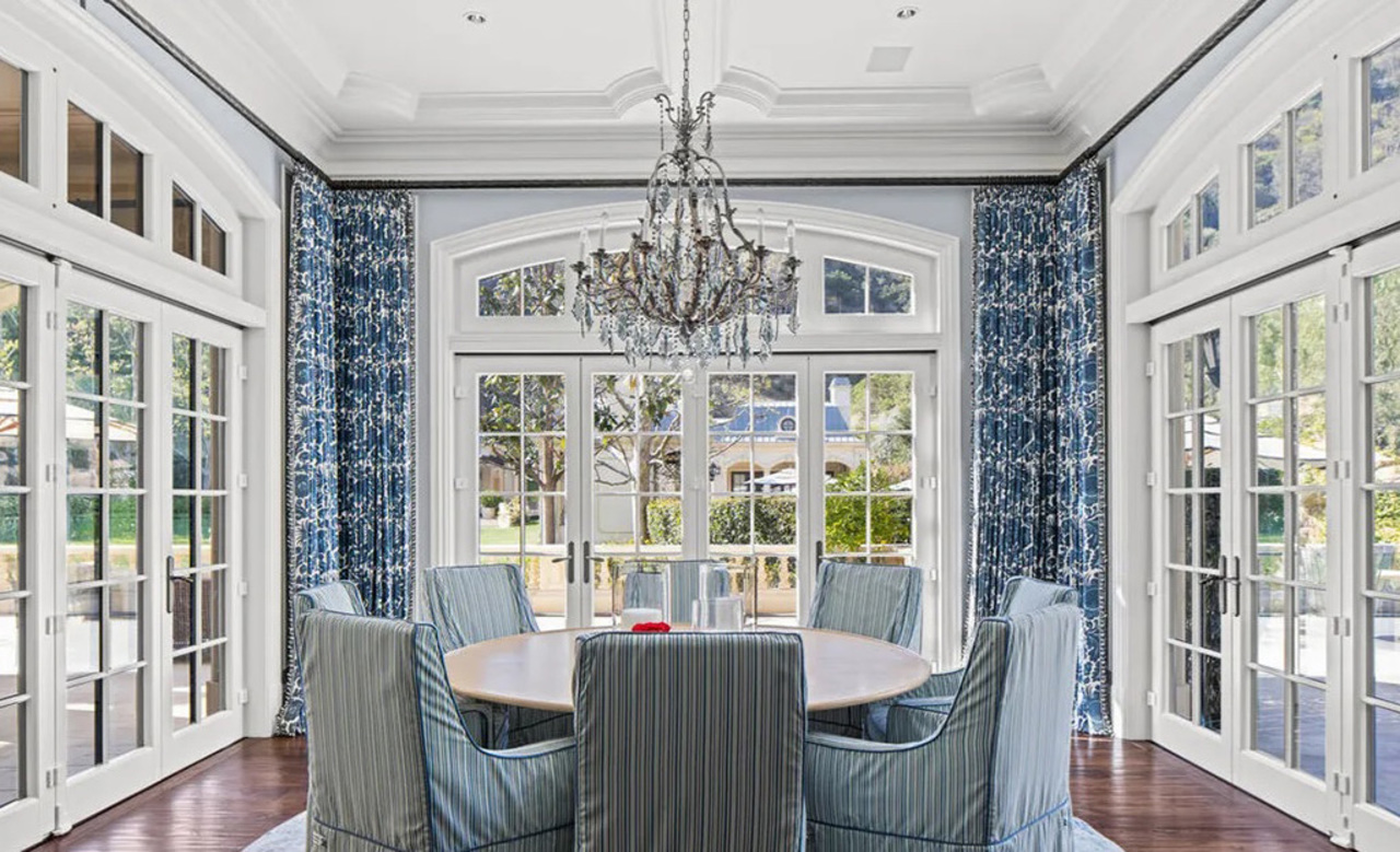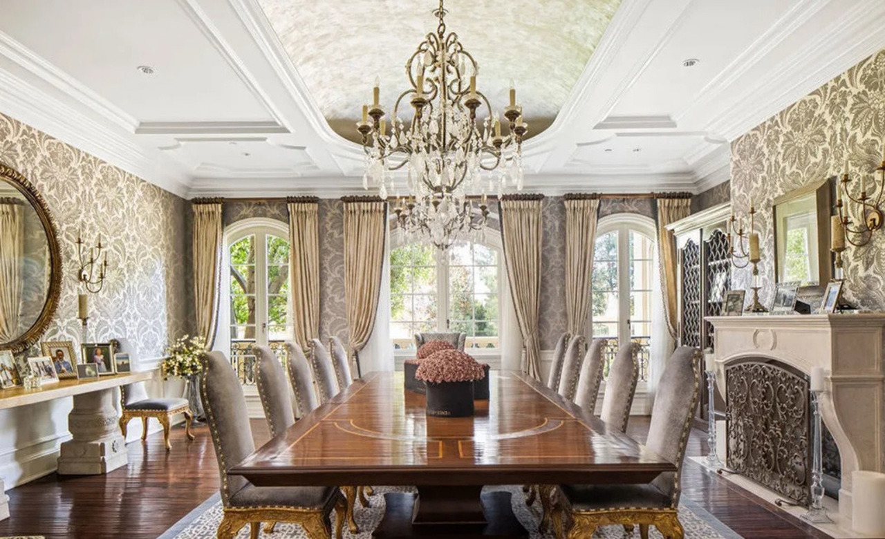 A napfényes reggelizőterem a birtokra néz, a külön hivatalos étkezőt pedig egy kristálycsillár díszíti. A konyhában pedig két hatalmas márvány tetejű sziget közül is lehet választani.