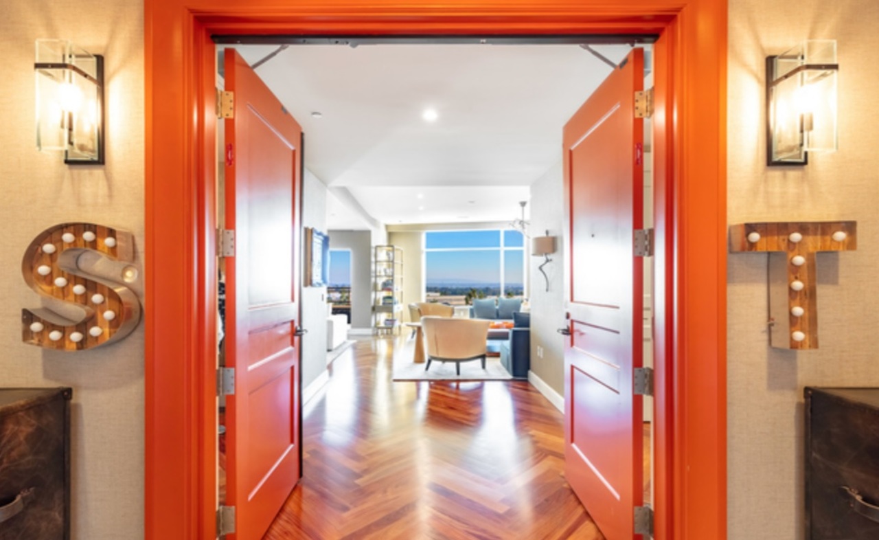 A nappaliban a teret az óriási kandalló határozza meg, amely viszonylag ritka lelet egy Los Angeles-i toronyházban.