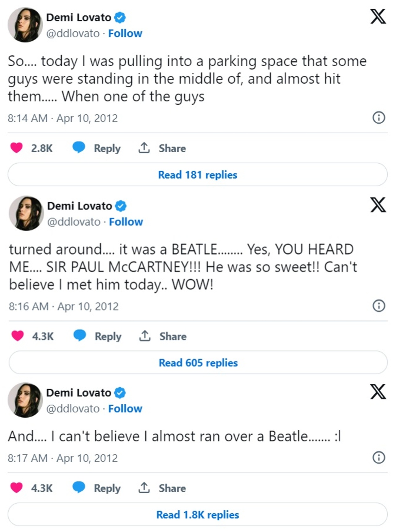 2012-ben, 20 éves korában a Twitteren ismerte be, hogy kis híján elütötte a The Beatles oszlopos tagját, miközben meggyűlt a baja a parkolással.