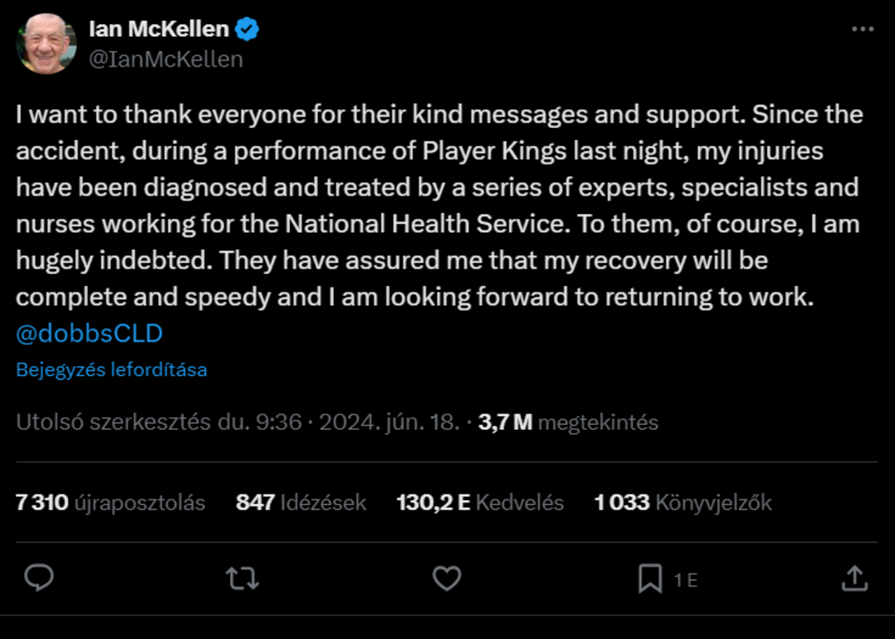 Így van most a balesetet szenvedett Ian McKellen