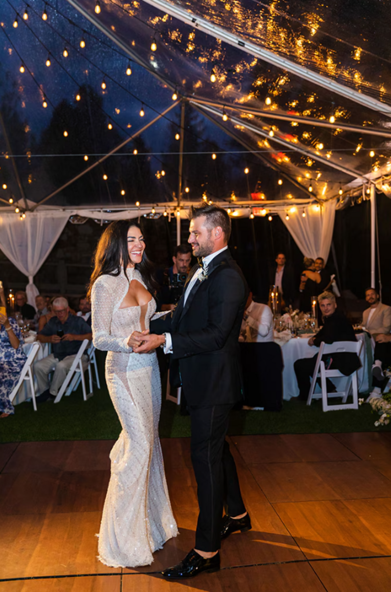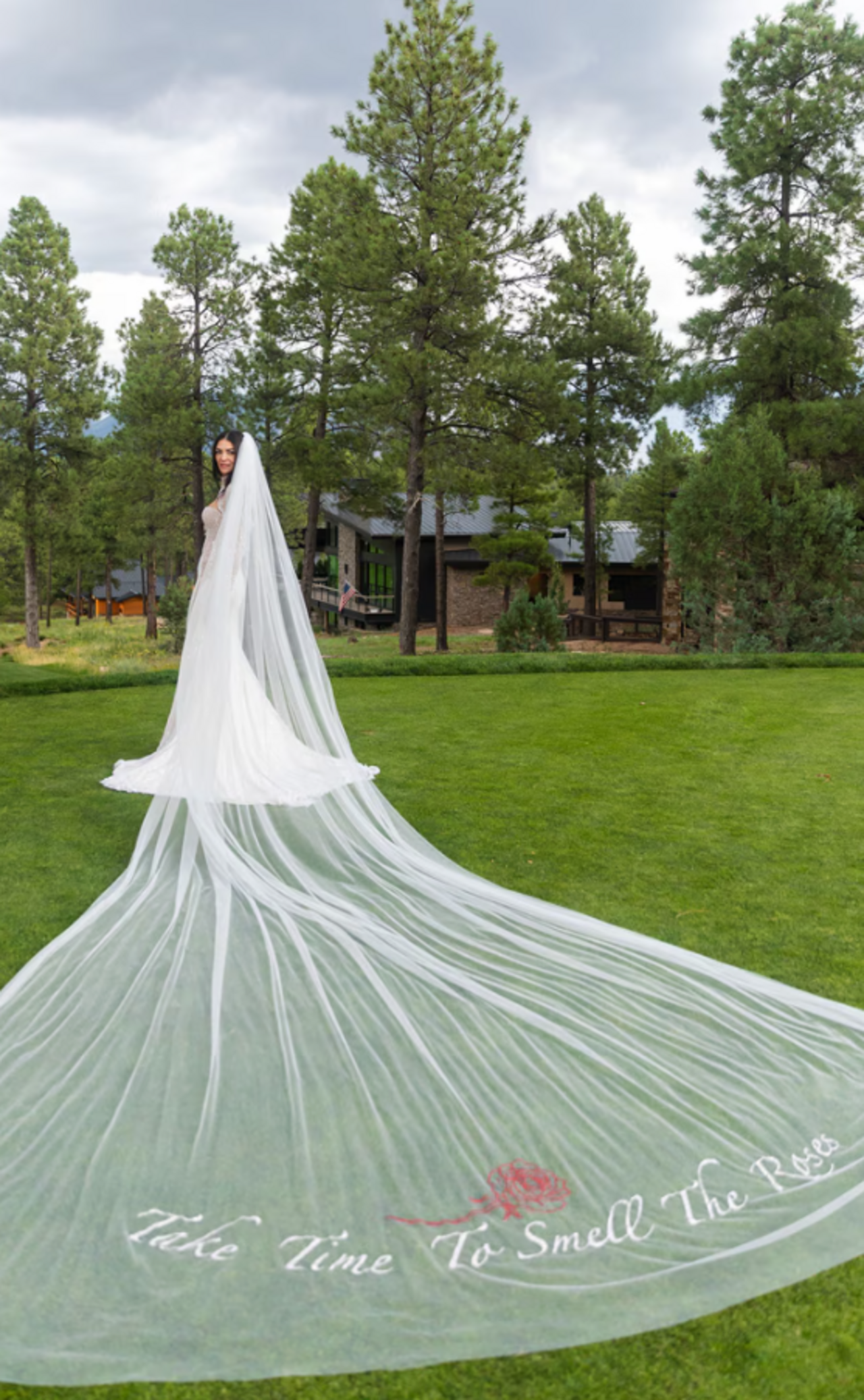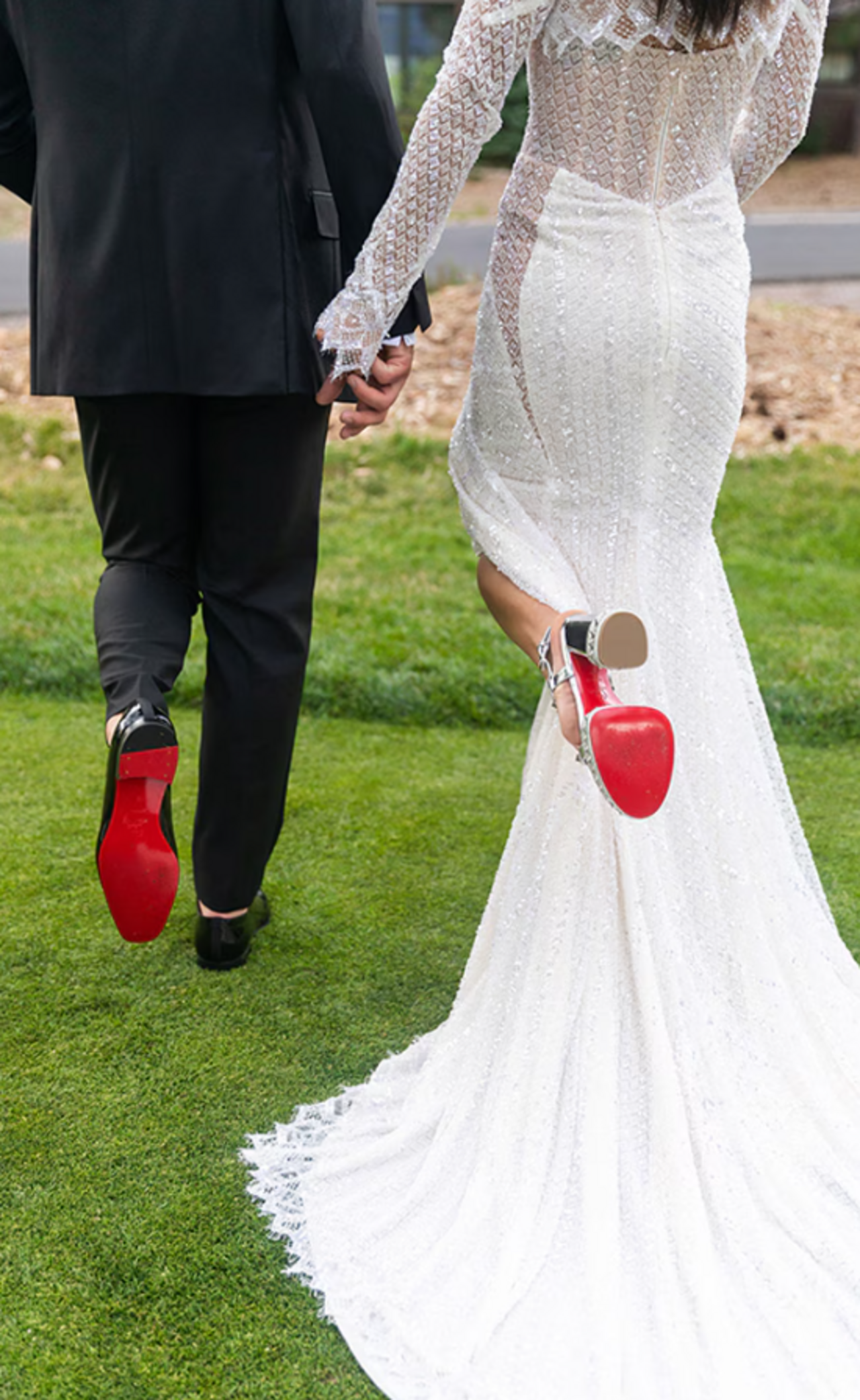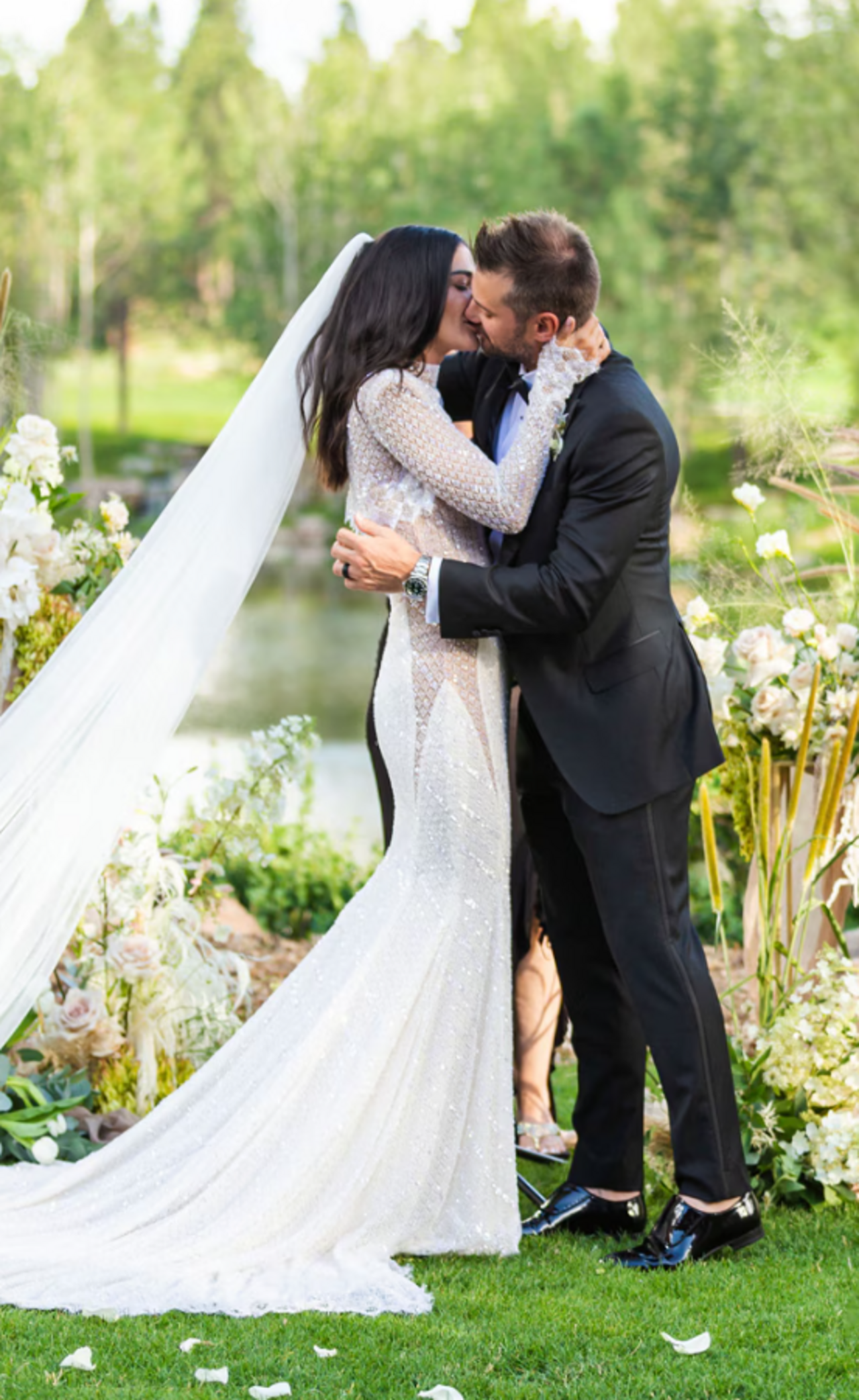 Az esküvőn a menyasszony egy csodálatos, részletgazdag ruhakölteményt viselt, melyhez egy Christian Louboutin-cipellőt választott. Különleges fátylával imádott nagypapájának állított emléket, aki sajnos nem érte meg, hogy velük ünnepeljen.