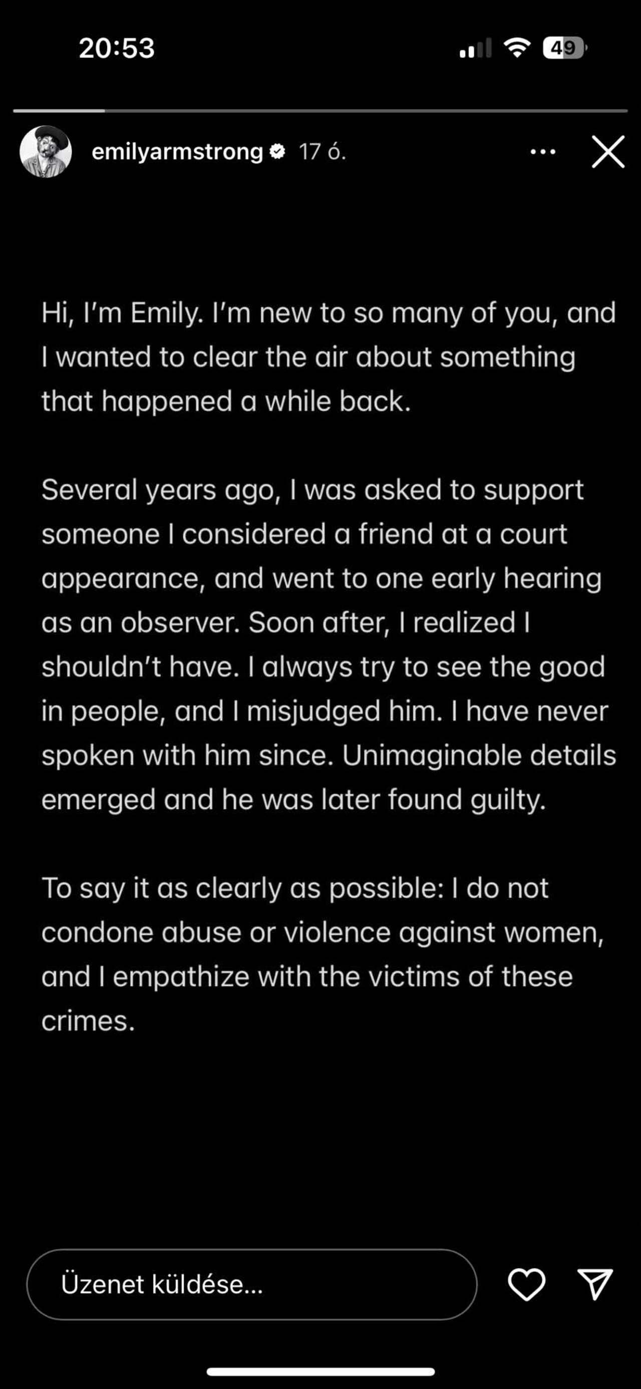 Sziasztok, Emily vagyok. Sokatok számára új vagyok és szerettem volna tisztázni valamit, ami korábban történt. Évekkel ezelőtt felkértek, hogy támogassak a bíróságon való megjelenésemmel valakit, akit a barátomnak tartottam, én pedig megfigyelőként elmentem egy meghallgatásra. Röviddel ezt követően rájöttem, hogy nem kellett volna. Mindig igyekszem meglátni a jót az emberekben, és félreismertem őt. Azóta soha többé nem beszéltem vele. Elképzelhetetlen részletek derültek ki és később bűnösnek is találtatott. Hogy a lehető legvilágosabban mondjam: nem tartom megbocsáthatónak a nők elleni abúzust vagy erőszakot és együtt érzek ezeknek a bűnöknek az áldozataival